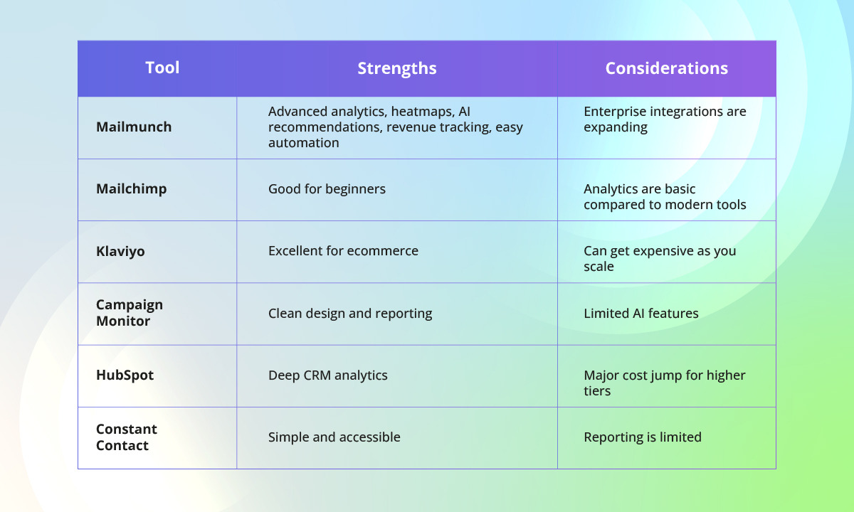 Here’s a quick, simple comparison of Mailmunch and a few well-known platforms. This table is necessary because it helps readers make sense of the landscape at a glance.